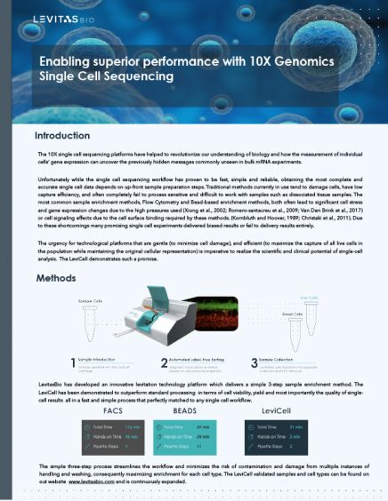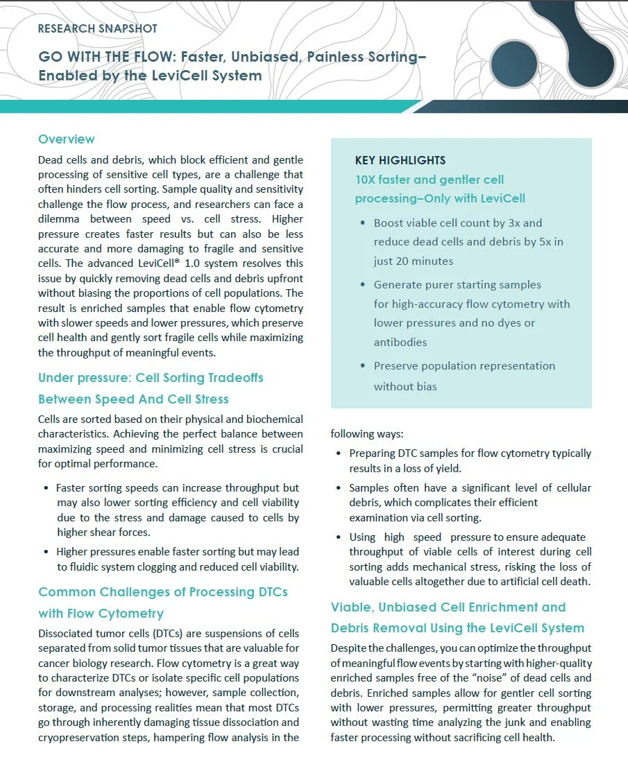 The advanced LeviCell® 1.0 system allows flow cytometry users to perform a simple, 3-step, 20 min walkaway viable enrichment run that enables faster processing time and improved sample resolution independent of dead cells and debris, initial sample viability, and initial starting cell numbers.