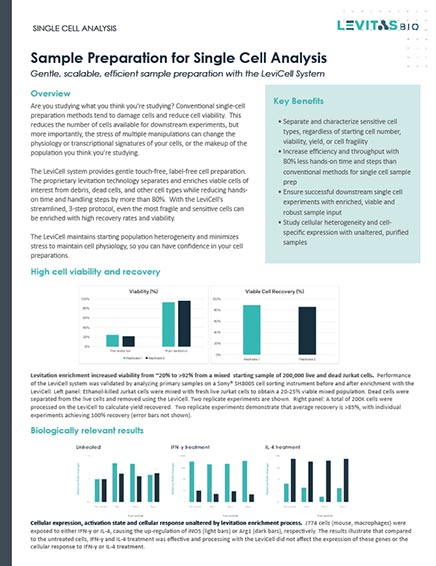 With LeviCell, you can shorten flow analysis and sorting times, improve scRNA-seq performance metrics, and minimize processing-induced stress, unwanted activation, and unnecessary cell loss.