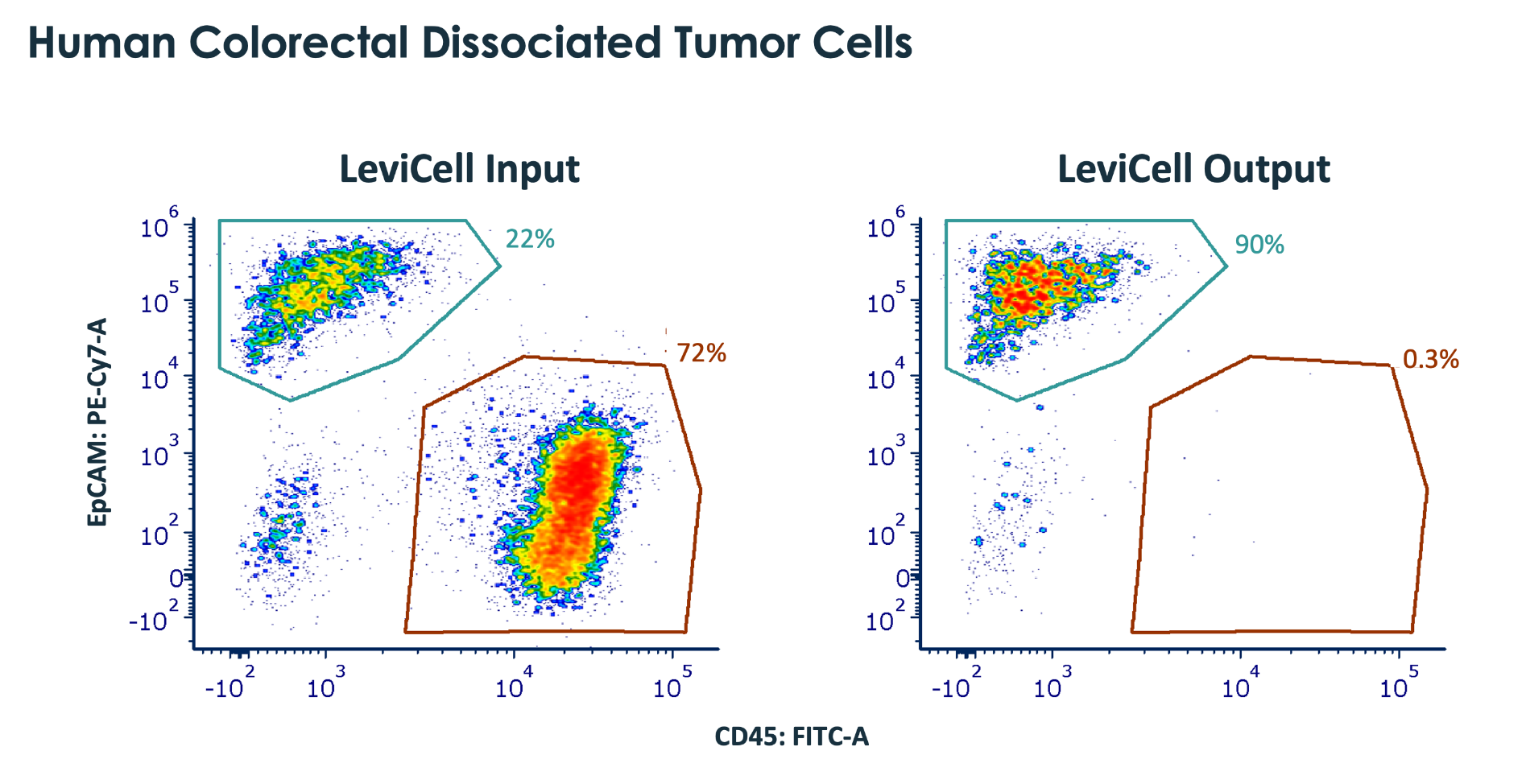 For oncology or immuno-oncology research, the LeviSelect CD45 Depletion Kits provide a highly effective method for enriching pure tumor cells enabling characterization for drug discovery and biomarker identification. Human or mouse CD45+ cells are depleted from a mixture of cells in parallel with viable cell enrichment on the LeviCell system. CD45+ cells are retained in the LeviCell cartridge, while CD45- cells of interest remain label-free and are collected for further downstream analysis.