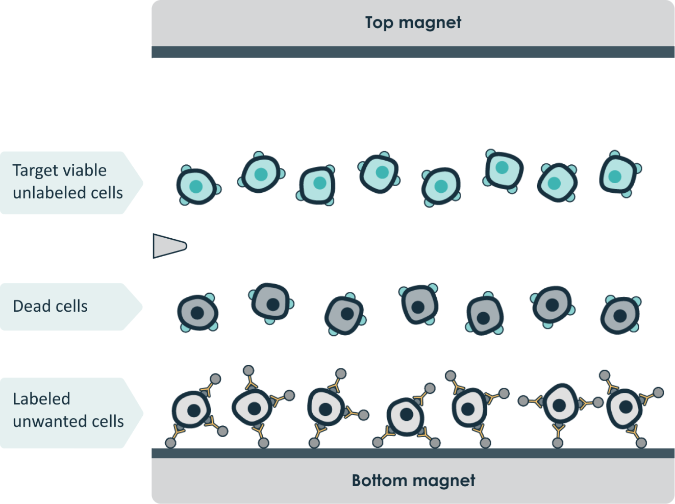 Depletion of mouse CD45+ cells from a mixture of cells with simultaneous viable cell enrichment using the LeviCell System. Mouse CD45+ cells are retained in the LeviCell cartridge, while the mouse CD45- cells of interest remain label-free and are collected for further downstream analysis.