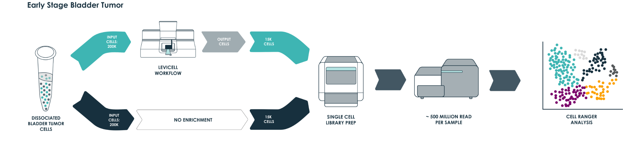 A similar trend is observed with the late stage cancer sample, although the trends are less pronounced. Here, the sample processing with the standard method shows a large number of cells with high diversity of UMI counts, and correspondingly five clusters of gene expression. After enrichment on the LeviCell 1.0 system, the sample has a larger number of cells with high diversity of UMI counts, and six clusters of gene expression clusters, indicating a superior view of the expression profiles.